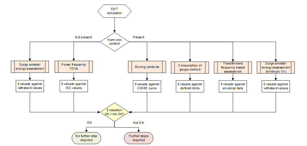 - Frequency-based assessment for power transformers method: It considers that the breakdown strength of transformer insulation is influenced by heat storage and dissipation. The power frequency withstand voltage of transformers - which should be an available information- is converter by the ratio of dielectric strength for the dominant harmonic frequency of the TOV.