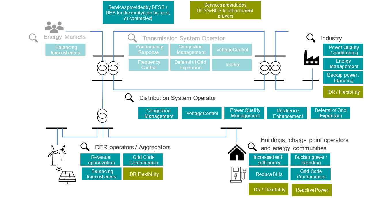 Figure depicts how DER, including BESS, are deployed and how services are provided to the grid and other systems in the grid. This diagram is used to present entities, use cases (marked in turquoise colour) and capabilities (marked in green) of BESS in conjunction with the renewable energy resources (RES) installations. Transmission system operators (TSOs) and energy market operators are considered out of scope of this TB.