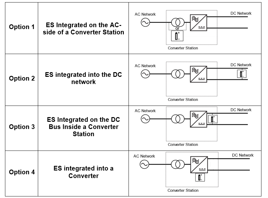 For HVDC systems, different options exist for integrating ES systems depending on the design, requirements, specifications, and cost considerations. Table 1 illustrates the potential locations. It includes integrating ES on the AC side of the converter station, on the DC side of the converter station or into a DC network, or within the converter submodules themselves.