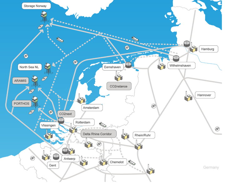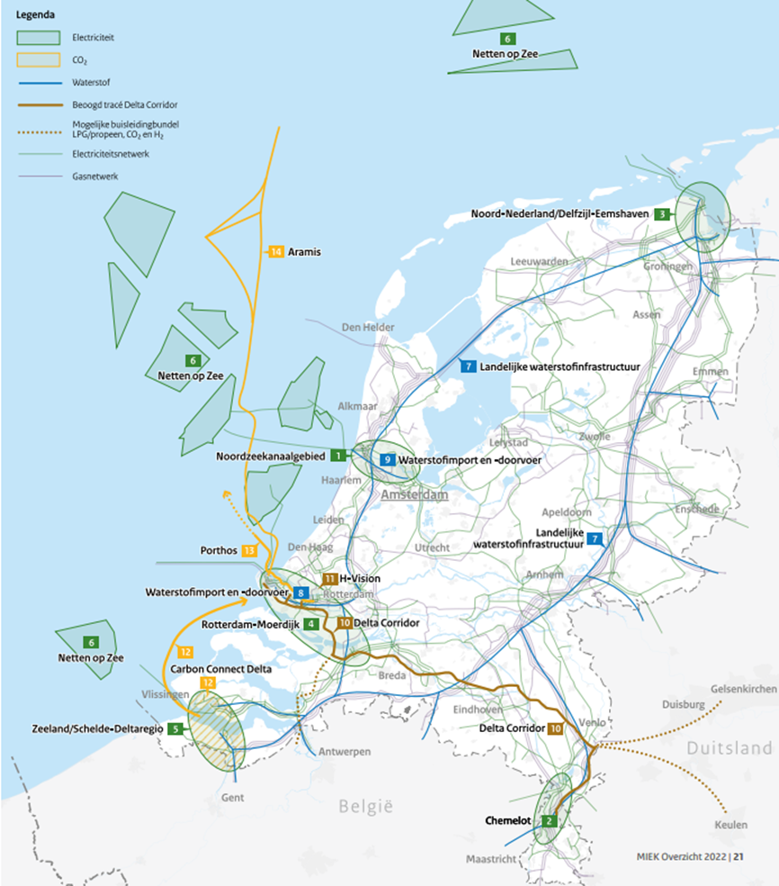 Moreover, sector integration brings efficiency, acceleration, and cost reduction as aimed for example in the plans for the Delta Rhine Corridor (Figure 3 brown route), which will connect the ports of Rotterdam and Antwerp to major industrial centres in the Netherlands, Belgium, and Germany with a 270-kilometre corridor for hydrogen- en CO₂ pipelines and 3 2GW DC cables to transport renewable offshore wind electricity.