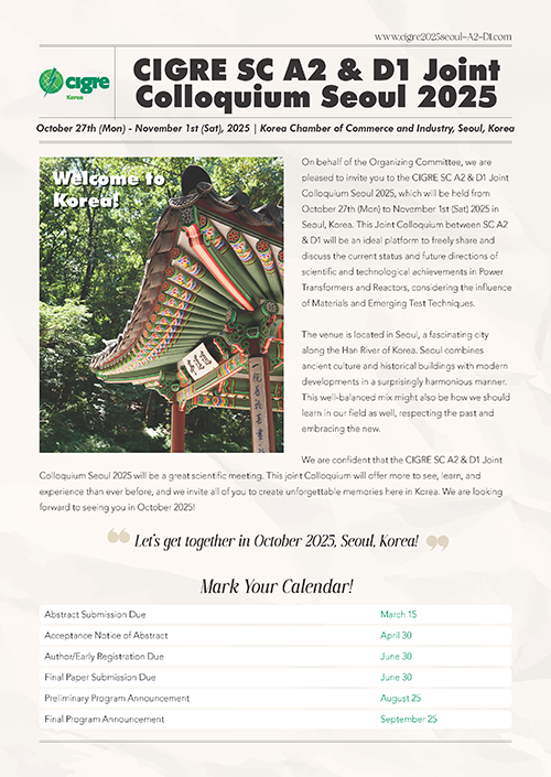 On behalf of the Organizing Committee, we are pleased to invite you to the CIGRE SC A2 & D1 Joint Colloquium Seoul 2025, which will be held from October 27th (Mon) to November 1st (Sat) 2025 in Seoul, Korea. This Joint Colloquium between SC A2 & D1 will be an ideal platform to freely share and discuss the current status and future directions of scientific and technological achievements in Power Transformers and Reactors, considering the influence of Materials and Emerging Test Techniques.