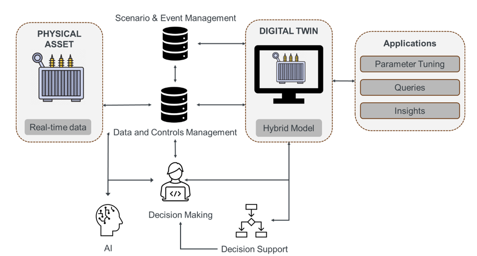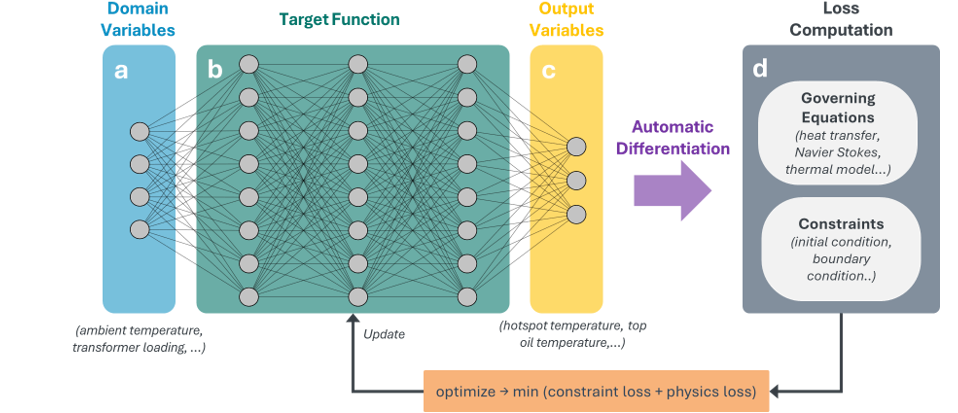 Let us take a case of a digital twin model for estimating the dynamic overloading of transformers, which balances increasing transformer utilization efficiency with maintaining high system reliability. PINNs can model the thermal behavior of the transformer by incorporating the physics of heat dissipation in the transformer oil to estimate the hotspot temperature from the real time inputs such as loading and ambient temperature. Top oil temperature measurement can be used for calibration of the model by comparing the estimated and measured value.