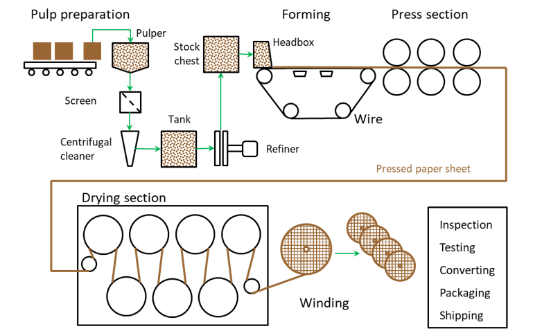 The fibre orientation in the materials is linked to the production method. On a paper machine for example the fibres are aligned to a certain degree with the operating direction of the paper machine (see Figure 1). The tensile properties of the paper are therefore the highest in machine direction.