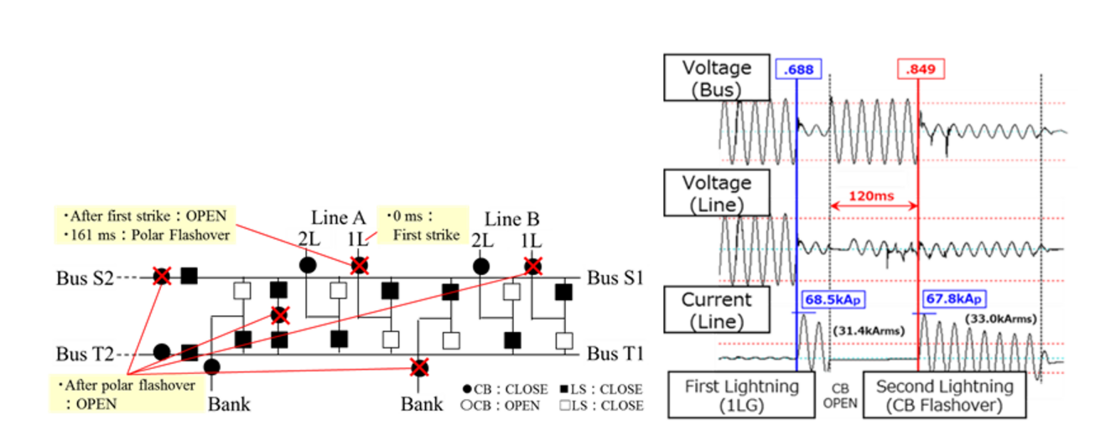 Analyzing and investigating on-site incidents is important for developing countermeasures against direct lightning. Additionally, understanding the mechanisms behind lightning surge overvoltage caused by direct and multiple strikes is essential. Furthermore, the insulation between the poles of a gas circuit breaker can be weakened by the hot gas generated during the initial interruption [2]. Given the equipment cost, enlarging circuit breaker dimensions to increase dielectric strength is impractical; therefore, reviewing the substation design is a more effective solution.