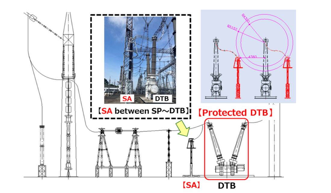 This work recommends installing an additional SA with a residual voltage of 870kV between the station post and the breaker. The electrical distance is less than 10 meters, as shown in Figure 3. All line DTBs (TEPCO PG: 98 Line) have been reviewed to assess whether a countermeasure is necessary. However, when the line DTB connects to a transmission line with more than approximately 50 meters between the DTB and the SA, there may be a risk of an accident without implementing countermeasures. Conversely, GIS systems with GIB connections are considered sufficiently protected under current designs.
