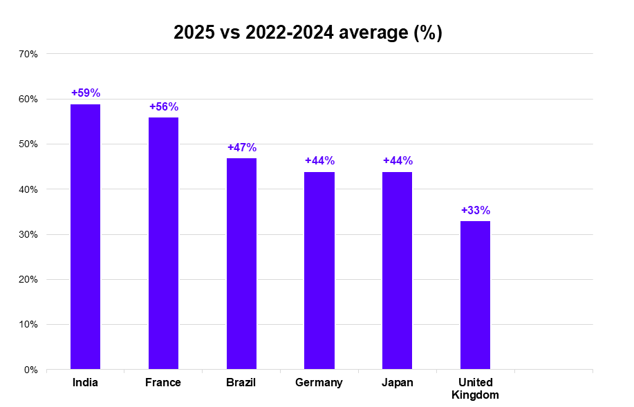 Notable increases include India (+59%) and France (+56%), confirming ELECTRA’s growing reach across regions.