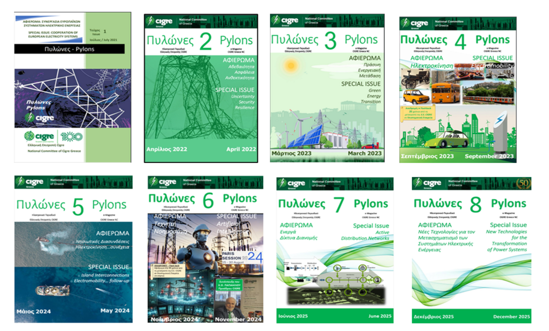 The Greek National Committee (GNC) of CIGRE – CIGRE Greece – publishes the online electronic bilingual (in Greek or English language) magazine entitled “Pylons” hosting invited articles on contemporary aspects of Power Systems, interviews, newsletter as well as history flashback of the GNC. July 2026 will mark the 5th anniversary of the magazine published twice a year.