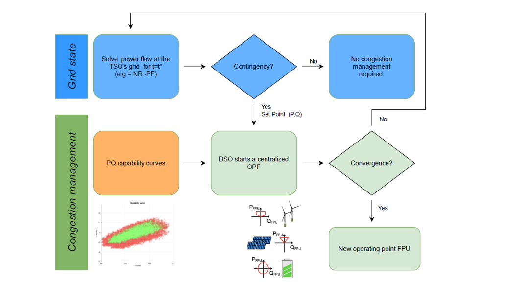 - Voltage control: this is performed in cooperation with conventional generation units; both TSOs and DSOs communicate directly with generator operators. Optimal reactive power exchanges between the TSO and the DSO can be achieved by specifying optimal power or reactive voltage control points at the point of common coupling (PCC).