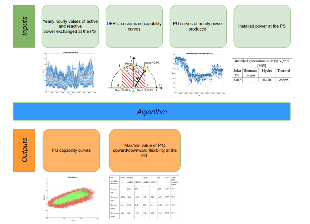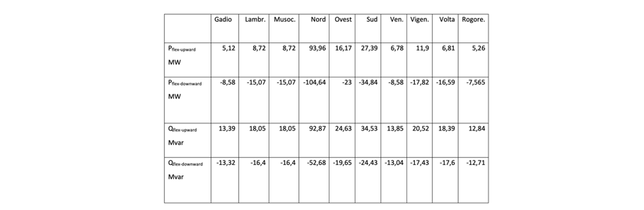 The proposed approach identifies, for each hour, the maximum flexibility variations (Pflex upward/downward; Qflex upward/downward). Specifically, it calculates these values for all points that define the capability curve of each type of DER. The algorithm then selects, among these, the maximum and minimum variations with respect to the measured power values at the PS. Table 1 reports the maximum flexibility values achieved in 2030, along with the corresponding contributions from each DER source.