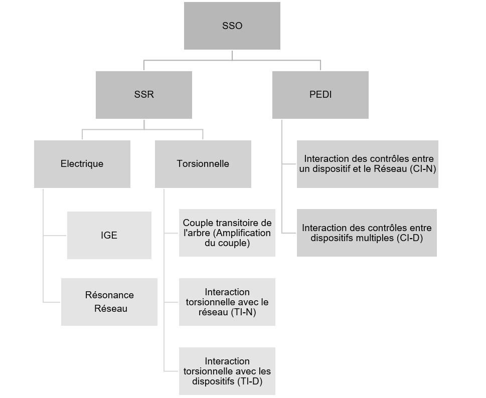 Les SSO sont regroupées en deux grandes catégories : les Résonances Subsynchrones (SSR) et les Interactions de Dispositifs d'Electronique de Puissance (PEDI). Les SSR sont ensuite classées en Electriques et Torsionnelles, pour différencier les SSR purement électriques, pour lesquelles les phénomènes de torsion n'interviennent pas, et ceux où ils interviennent. Les SSR de type électrique peuvent être dus à la résonance en réseau quand il existe des dispositifs de compensation série dans le réseau, où ils peuvent être dus à la résistance négative présentée par un générateur à une fréquence de résonance du réseau. Dans les deux cas les systèmes d'arbre ne sont pas impliqués. Les SSR de type torsionnel se subdivisent en trois types : l'amplification du couple d'arbre, les interactions torsionnelles avec le Réseau (TI-N), et les interactions torsionnelles avec un autre dispositif (TI-D). La nouvelle catégorie de SSO introduite est celle des Interactions des Dispositifs à Electronique de Puissance (PEDI). Ce sont des interactions des systèmes de contrôle de deux types : Interactions de Contrôle avec le Réseau (CI-N) et Interactions de Contrôle avec un autre Dispositif (CI-D). Tous ces types de SSO ont été observés par des compagnies d'électricité et bien décrits, et sont étudiés dans le chapitre.